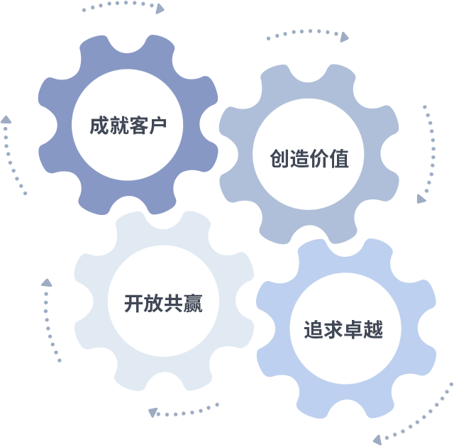 成就客户是一切决策的出发点,创造价值是衡量所有工作的标准,追求卓越是888腾博会做事做人的态度,开放共赢是888腾博会的格局也是最终的结果。价值观的齿轮环环相扣,推动着组织里的每个人不断向前。